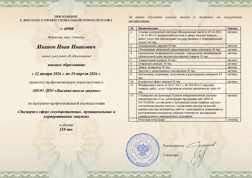 Вы получаете официальные документы об образовании (дипломы и удостоверения). Высшая школа закупок (fz44.org) в обязательном порядке вносит все сведения в федеральный реестр ФИС ФРДО, подтверждая вашу квалификацию перед любым государственным или коммерческим работодателем Махачкалы и Республики Дагестан.