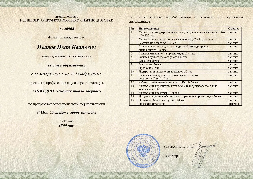 Вы получаете престижный диплом о профессиональной переподготовке с присвоением квалификации эксперта (MBA). Высшая школа закупок (fz44.org) в обязательном порядке вносит сведения об обучении в Махачкале в реестр Рособрнадзора, подтверждая ваш высший квалификационный статус.