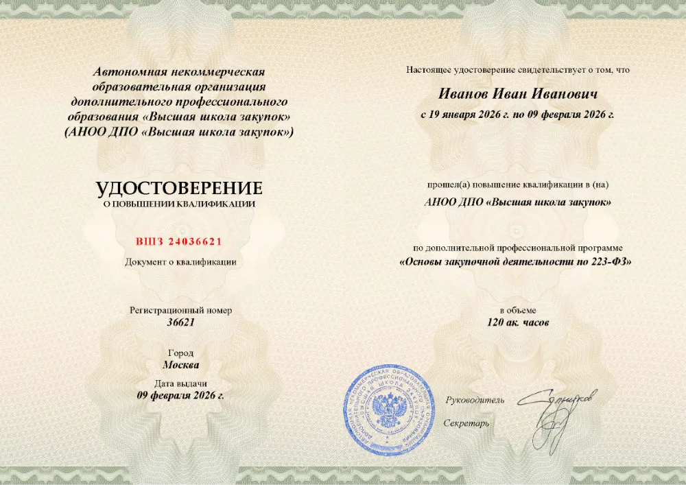 Вы получаете официальные документы об образовании (дипломы и удостоверения). Высшая школа закупок (fz44.org) в обязательном порядке вносит все сведения в федеральный реестр ФИС ФРДО, подтверждая вашу квалификацию перед любым государственным или коммерческим работодателем Махачкалы и Республики Дагестан.